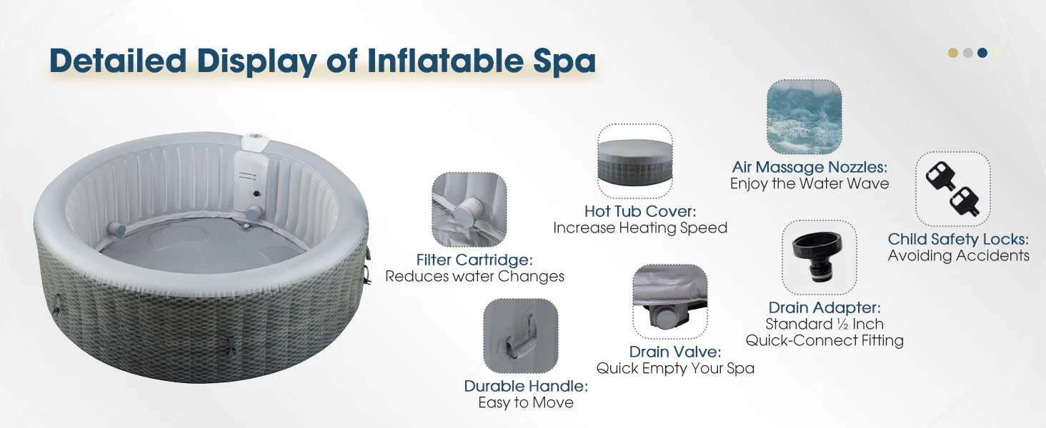 Place your spa on a smooth, flat surface away from sharp or rocky areas to prevent punctures. Avoid leaving it inflated under direct sunlight for extended periods, as excess heat can damage or deform the PVC material. Damage caused by improper use or exposure may not be covered under warranty.
